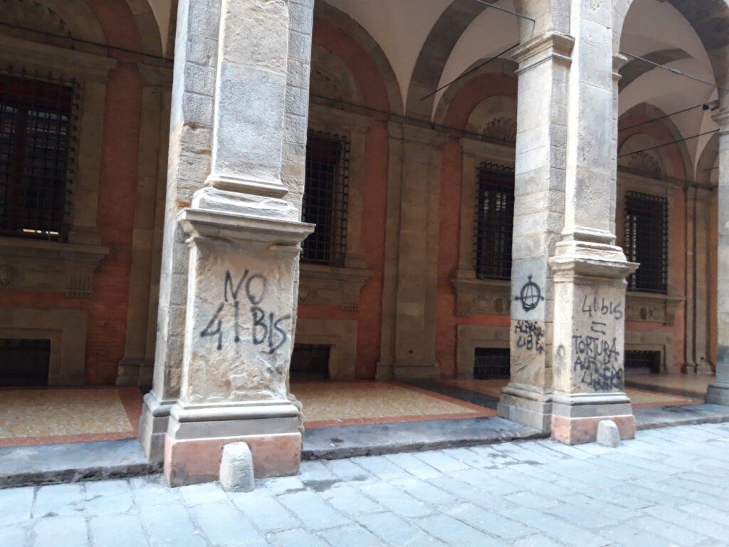 Hanno deturpato un edificio storico, prima ancora che una sede istituzionale, i sedicenti anarchici che hanno imbrattato con le scritte “No al 41 bis, Alfredo libero” cinque colonne di Palazzo Malvezzi, in via Zamboni, già sede della Provincia, oggi della Città Metropolitana di Bologna. L’edificio, costruito alla fine del 1500, è stato tra l’altro oggetto di un importante restauro negli anni recenti, tra il 2017 e il 2018. Sarà necessario un intervento di tecnici specializzati sotto la supervisione delle belle arti, per rimuovere il danno fatto con le bombolette