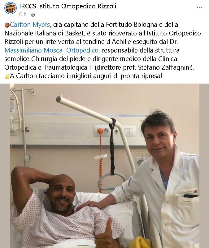Carlton Myers, ex capitano della Fortitudo Bologna e della Nazionale Italiana di Basket, è stato ricoverato all’Istituto Ortopedico Rizzoli per un intervento al tendine d’Achille. Lo fa sapere le stesso ospedale, che pubblica anche una foto di Myers insieme al dottor Massimiliano Mosca, l’ortopedico che ha eseguito l’intervento e che è responsabile della struttura semplice Chirurgia del piede e dirigente medico della Clinica Ortopedica e Traumatologica II. “A Carlton facciamo i migliori auguri di pronta ripresa!” scrive ancora il Rizzoli nel post pubblicato su Facebook, che in poche ore ha ricevuto centinaia di ‘like’ e di commenti di auguri per l’ex cestista.