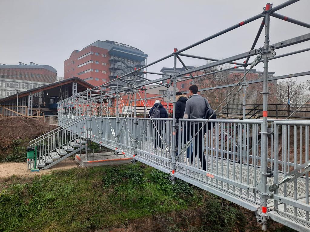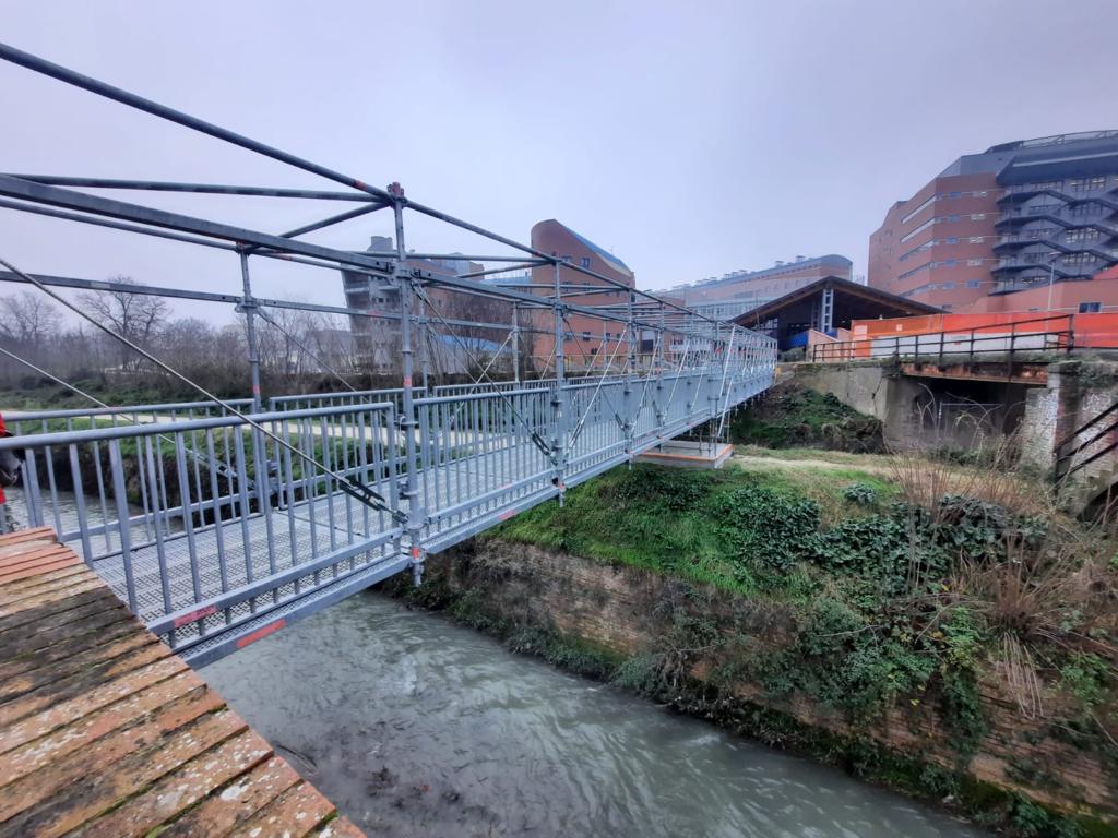 Taglio del nastro oggi a Bologna per la nuova passerella sul Canale Navile in via Bignardi, nei pressi del Battiferro, che garantisce a tanti studenti l’accesso al vicino polo universitario. La nuova struttura in acciaio è stata inaugurata questa mattina dall’assessore ai Lavori pubblici Simone Borsari, dalla presidente del quartiere Navile Federica Mazzoni e dalla prorettrice dell’Università di Bologna, Simona Tondelli. La passerella in acciaio ristabilisce un collegamento pedonale e ciclabile alternativo al ponte Battiferro Bignardi, chiuso in via cautelativa il 7 ottobre scorso dopo che il sopralluogo di monitoraggio trimestrale aveva riscontrato criticità strutturali che saranno oggetto di un restauro. La nuova passerella metallica, a nord del ponte esistente, larga 2,07 metri, è costituita da una struttura in elementi tubolari prefabbricati in acciaio zincato a due campate. L’importo dei lavori è di circa 89.000 euro, cui si è provveduto con avanzo del bilancio del 2022.