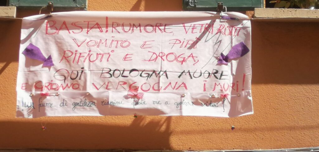 Questa mattina si sono silenziosamente fatti sentire ancora una volta i residenti di via Petroni, sempre nella zona unversitaria di Bologna, che hanno attaccato striscioni contro il degrado e le notti di movida nei giorni scorsi: “Basta rumore vetri rotti , vomito e pipì, rifiuti e droga – si legge in uno di questi – qui Bologna muore e gridano vergogna i muri! Un fiume di gentilezza rianimi queste vie a gioiosa vita!”