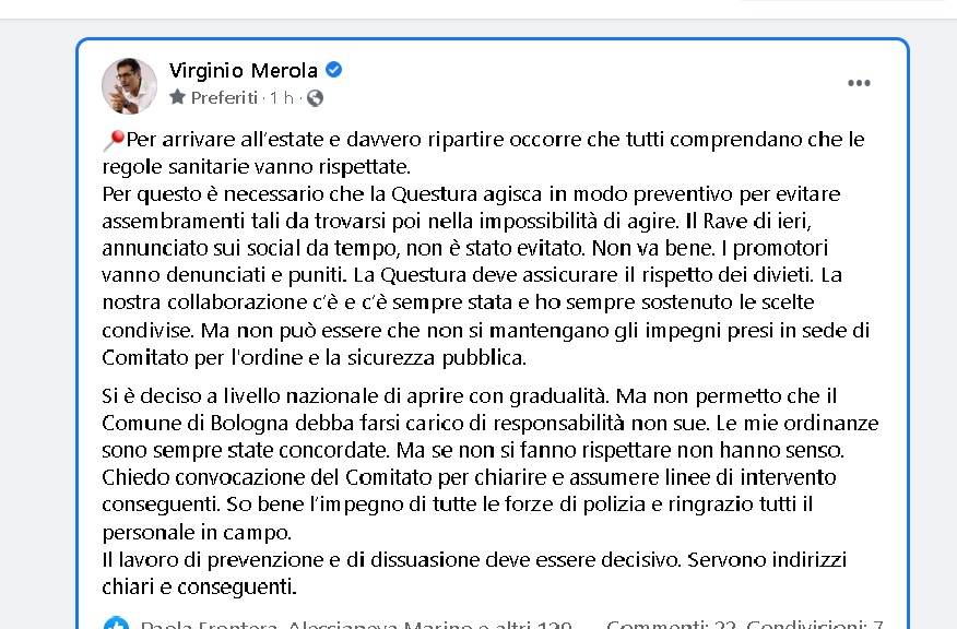Centinaia di giovani, molti senza mascherina, si sono radunati per una festa in violazione delle disposizioni per contenere i contagi da coronavirus. Occorre mantenere “gli impegni presi in sede di Comitato per l’ordine e la sicurezza pubblica – insiste Merola – Si è deciso a livello nazionale di aprire con gradualità, ma non permetto che il Comune debba farsi carico di responsabilità non sue”.
