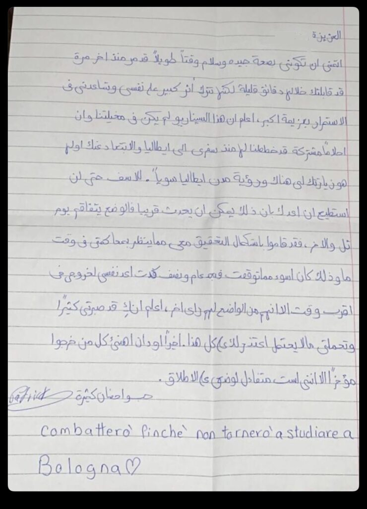 Ancora una lettera dal carcere di Patrick George Zaki, il ricercatore dell’Università di Bologna detenuto in Egitto, suo Paese natale. Alla fidanzata ha scritto: “Combatterò finché non tornerò a studiare a Bologna”. A rendere nota la lettera è stata la pagina social degli attivisti ‘Patrick Libero’. “La mia indagine è ripresa – si legge ancora – il che potrebbe significare che un giorno andrò in tribunale e avrò un processo e questo è molto peggio di quanto mi aspettassi. Dopo un anno e mezzo, non potevo fare a meno di pensare che avrò presto la mia libertà, ma ora è chiaro che non accadrà presto”.