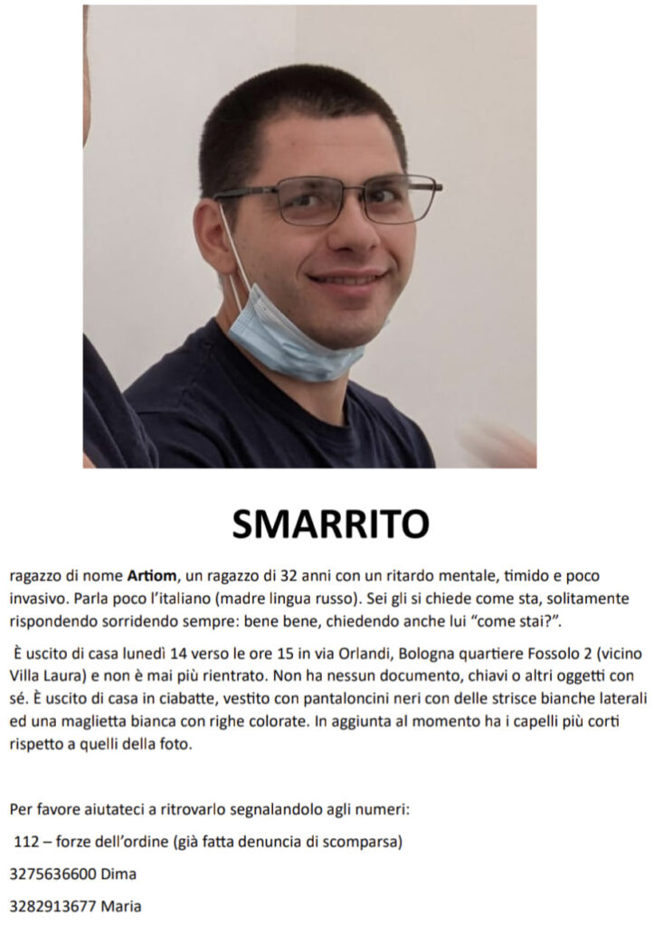 E’ scomparso da casa dal pomeriggio di lunedì 14 agosto e da allora i familiari non hanno notizie di lui. Si chiama Artiom, ha 32 anni e soffre di un lieve ritardo mentale ma non è aggressivo -spiegano i parenti- è molto timido e non parla bene l’italiano, essendo madrelingua russo. E’ uscito di casa, in via Orlandi zona Fossolo, verso le 15 e indossava ciabatte, un paio di pantaloncini corti neri con strisce laterali bianche e una t-shirt bianca a righe colorate. Non ha con sé documenti. Al momento ha i capelli più corti rispetto alla foto.