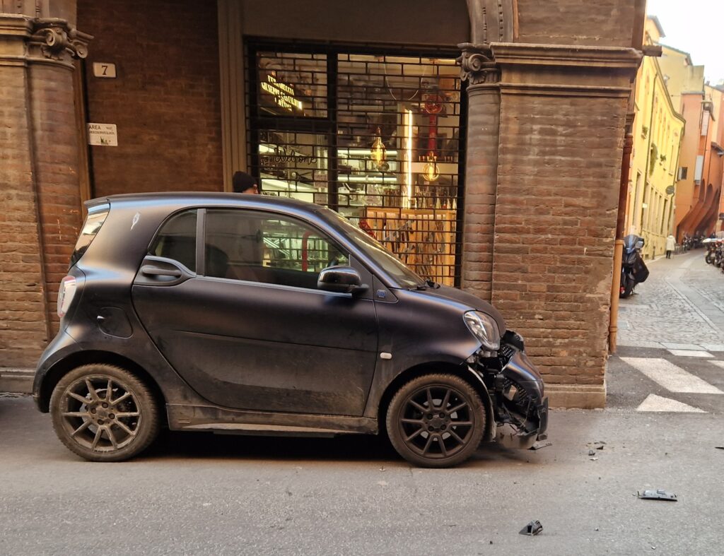 È stata una mattinata di caos e incidenti proprio sotto le due torri nel pieno centro di Bologna, tra cantieri e mezzi in manovra per l’approvvigionamento delle merci. A farne le spese un’auto parcheggiata sotto le Due torri e uno dei fittoni di cemento che delimitano l’area pedonale che si trova in piazza della Mercanzia.