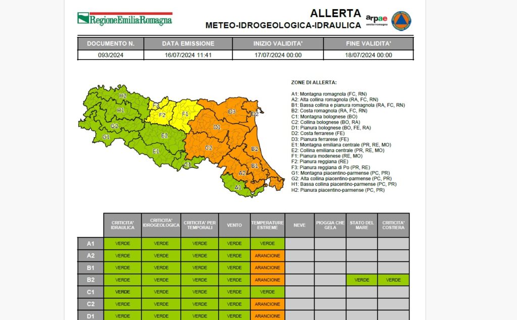 Allerta di colore arancione per temperature estreme, intorno ai 38 gradi o localmente superiori, sulle zone di pianura dell’Emilia-Romagna. A disporla l’Arpae e la Protezione Civile regionale secondo cui sono previste temperature massime superiori a 38 gradi sulla pianura centro-orientale. L’allerta arancione riguarda, in particolare, la collina, la pianura e la costa romagnola; la collina e la pianura bolognese; la pianura e la costa ferrarese. Disposta invece una allerta gialla, sempre per temperature estreme, sulla pianura modenese e reggiana.