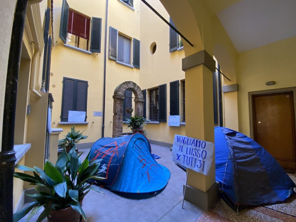 Nuova occupazione dei collettivi studenteschi nella sede del Camplus in via Zamboni a Bologna. Una decina di minuti prima delle 14, gli attivisti del Cua sono entrati nell’edificio dove ci sono alloggi per universitari, e hanno occupato gli uffici dell’azienda per “denunciare la presenza massiccia a Bologna di studentati di lusso a prezzi inaccessibili. Siamo stanchi di vivere in una città dove una stanza costa sempre di più e dove si preferisce aprire studentati privati di lusso invece di investire in soluzioni per l’emergenza abitativa”, scrivono gli attivisti. “L’occupazione è durata più di due ore e mezza, causando paura e smarrimento, e ha costretto i nostri lavoratori a non poter uscire dagli uffici se non dopo l’arrivo delle Forze dell’Ordine”, fa sapere l’azienda