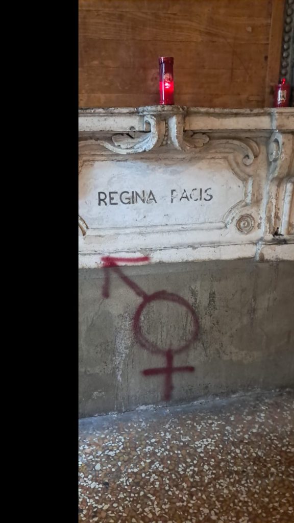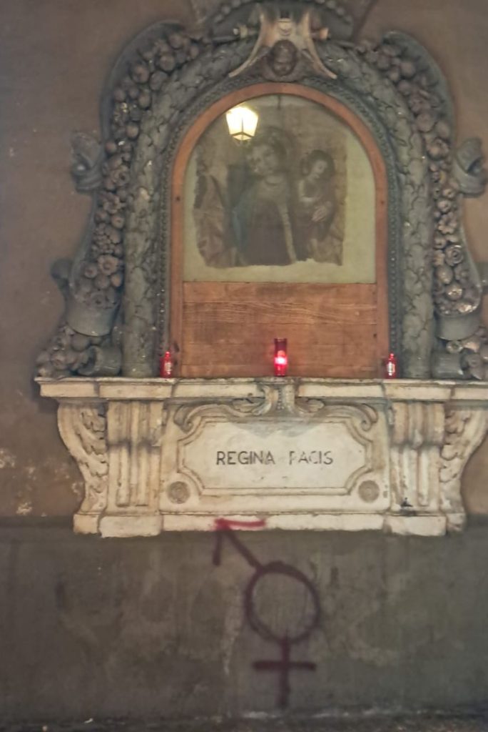 Durante la manifestazione che ha visto sfilare centinaia di persone a Bologna, nelle giornata internazionale per l’eliminazione della violenza sulle donne, non sono mancati gli episodi di imbrattamento che hanno danneggiato muri, portoni e anche l’affresco della Vergine con il Bambino Gesù benedicente, opera che si trova sul muro laterale della basilica di Santa Maria dei Servi, sotto il portico di Strada Maggiore. Alcune foto mostrano che qualcuno ha tracciato, con vernice rossa, l’unione dei due simboli di genere sul tabernacolo con l’iscrizione ‘Regina Pacis’ che fa da cornice all’affresco.