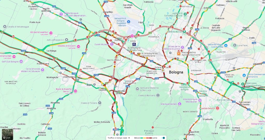 Ecco come si presenta il “traffico in tempo reale” attorno a Bologna. Una viabilità completamente congestionata a causa del blocco della tangenziale e dell’autostrada da parte dei manifestanti che, come è evidenziato nella cartina qui sotto, è l’unico tratto giallo in quanto non è consentito il traffico. I tempi di percorrenza anche per tratti brevi non sono inferiori ai 60minuti. Una situazione viaria praticamente al collasso