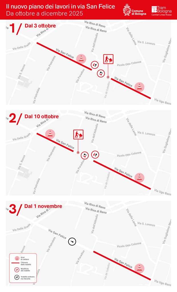 Dal 1° novembre è prevista infine la riapertura completa del primo segmento di San Felice, tra via Riva di Reno e via dell’Abbadia, che tornerà percorribile a senso unico come nel suo assetto originario, mentre resterà interdetta al traffico la porzione successiva, fino a via Marconi.