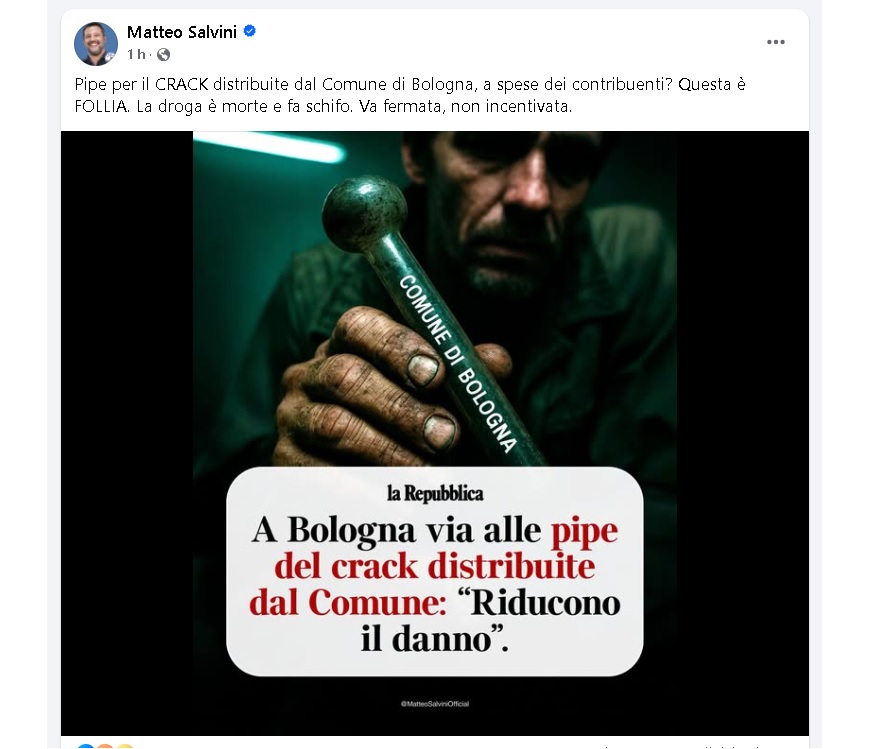 Il capogruppo alla Camera di Fratelli d’Italia, Galeazzo Bignami, ricorda che l’iniziativa dell’amministrazione bolognese cade proprio nelle ore in cui Giorgia Meloni, dal Meeting di Rimini, pronuncia parole forti contro la droga annunciando la sua visita alla Comunità di Recupero di San Patrignano