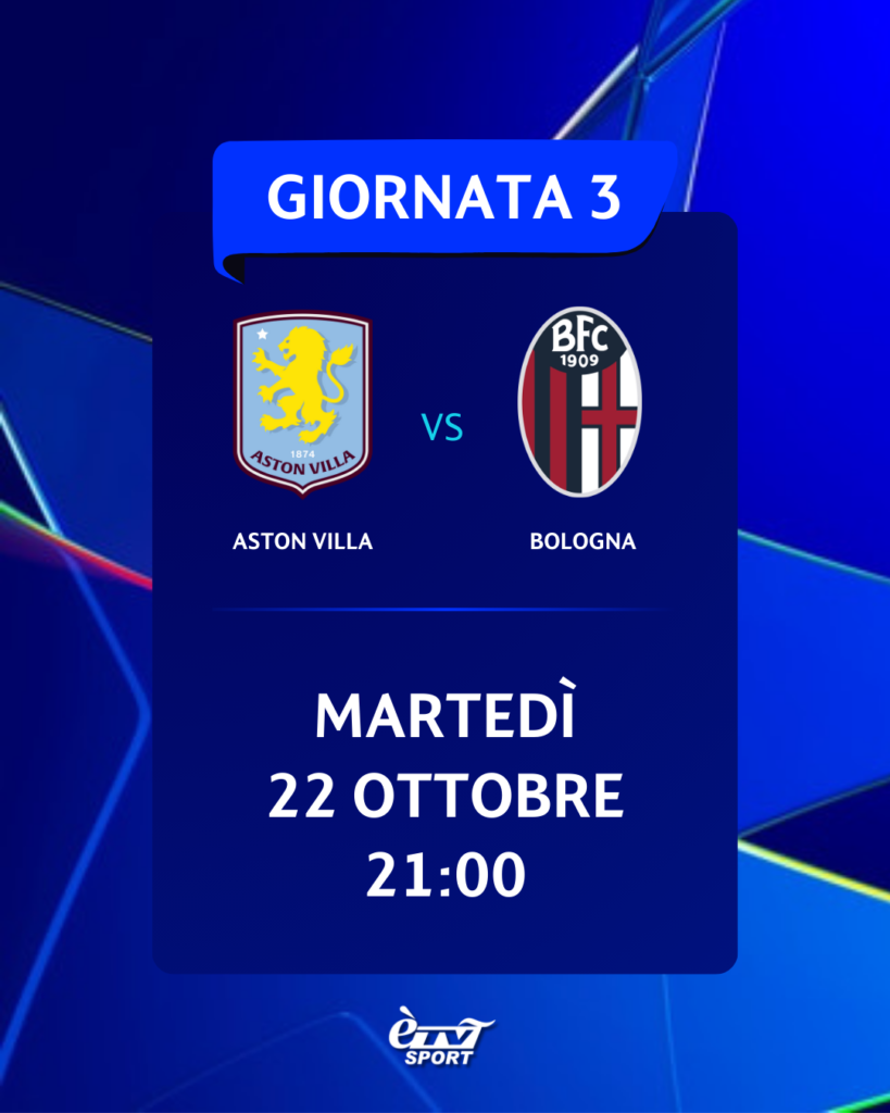 • 3° giornata, ASTON VILLA-BOLOGNA, martedì 22/10 ore 21;
