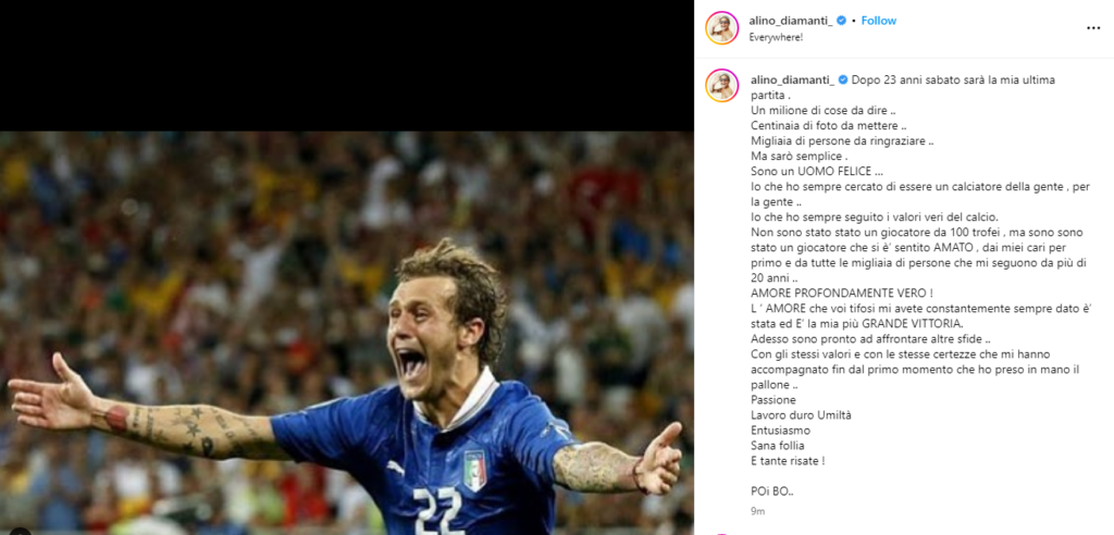 “Dopo 23 anni sabato sarà la mia ultima partita . Un milione di cose da dire .. Centinaia di foto da mettere .. Migliaia di persone da ringraziare .. Ma sarò semplice . Sono un UOMO FELICE … Io che ho sempre cercato di essere un calciatore della gente , per la gente .. Io che ho sempre seguito i valori veri del calcio. Non sono stato stato un giocatore da 100 trofei , ma sono sono stato un giocatore che si è’ sentito AMATO , dai miei cari per primo e da tutte le migliaia di persone che mi seguono da più di 20 anni .. AMORE PROFONDAMENTE VERO ! L ‘ AMORE che voi tifosi mi avete constantemente sempre dato è’ stata ed E’ la mia più GRANDE VITTORIA. Adesso sono pronto ad affrontare altre sfide .. Con gli stessi valori e con le stesse certezze che mi hanno accompagnato fin dal primo momento che ho preso in mano il pallone .. Passione Lavoro duro Umiltà Entusiasmo Sana follia E tante risate !
