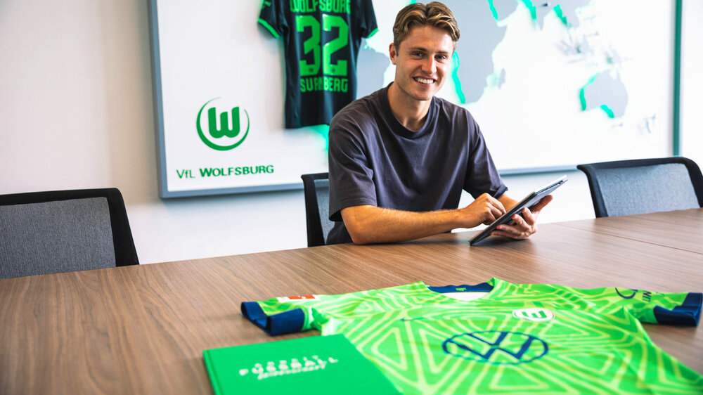 Il momento della firma di Svanebrg al Wolfsburg