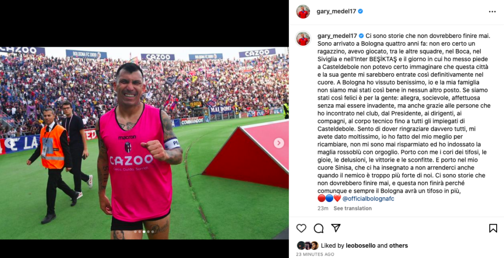 Dopo l’addio di Sansone, un altro senatore del Bologna lascia i rossoblù. Gary Medel, leggenda ed icona del calcio latinoamericano, non rinnoverà il suo contratto con il Bologna, a scadenza giugno 2023. Dopo 101 presenze, alcune delle quali con la fascia di capitano al braccio, “El Pitbull” ha scritto un lungo post sui social per ringraziare la città, la squadra e i tifosi: